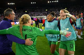 The holders looked to be heading home but two goals in three minutes sparked a chaotic comeback before Hannah Hampton and Lucy Bronze were the heroes in the shoot-out.